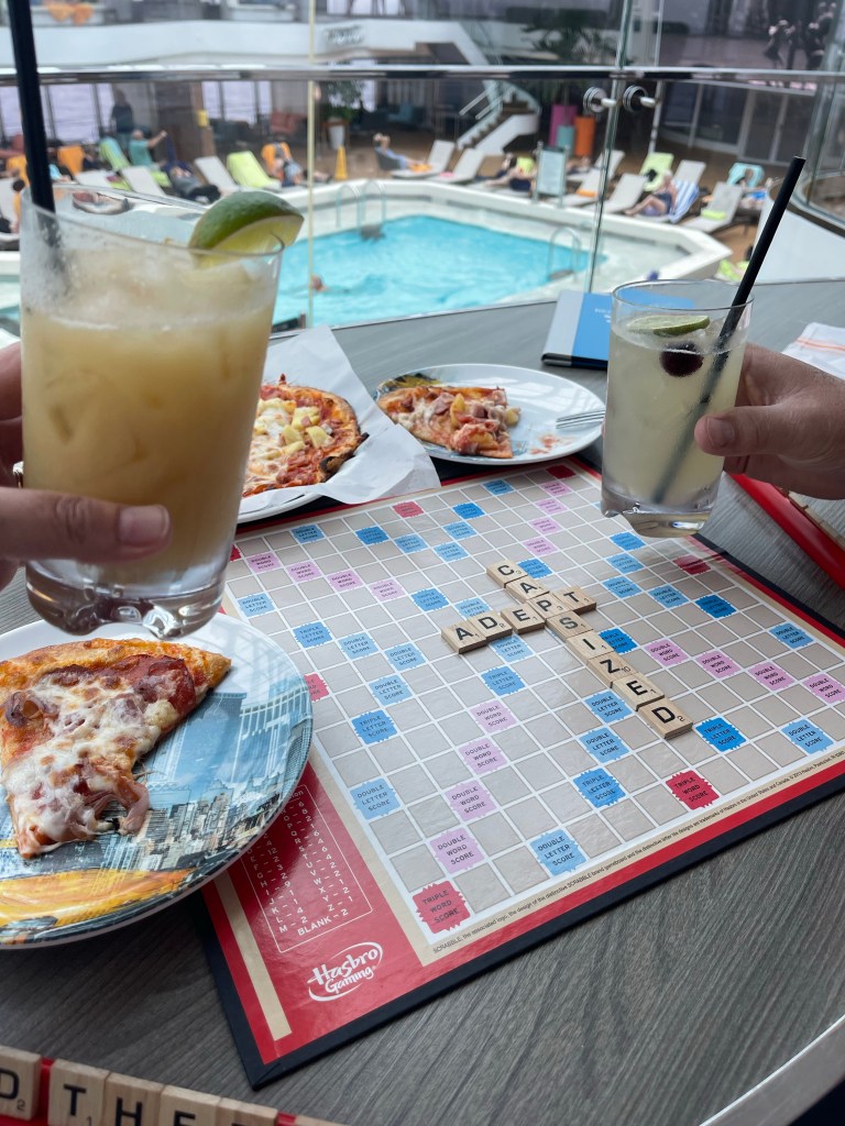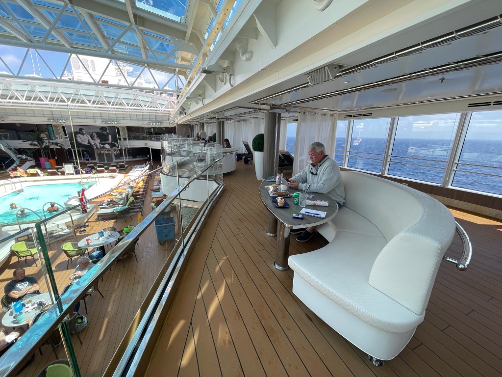 We have found a favorite afternoon spot for us is on the upper pool deck in a comfortable booth overlooking the pool. There are only 4 of these on the ship, yet there is always one available when we want one. We bring a deck of cards or a board game, get lunch at the Dive In or NY Pizza and Deli, order some drinks, and hang out there for a couple hours people watching, enjoying the sun and each other.