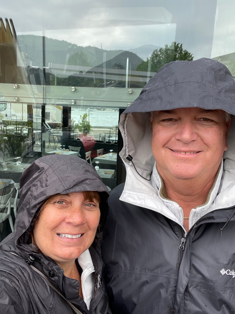 We had a four hour boat trip on Lake Como planned for today. Since it was drizzling with rain predicted for this afternoon, I emailed the boat company to see if we were still on for 1:00. They assured me we were and told us where to meet. We ate lunch at a covered outside area just across from the boat dock. Then about 12:45 we went out to the dock to wait.