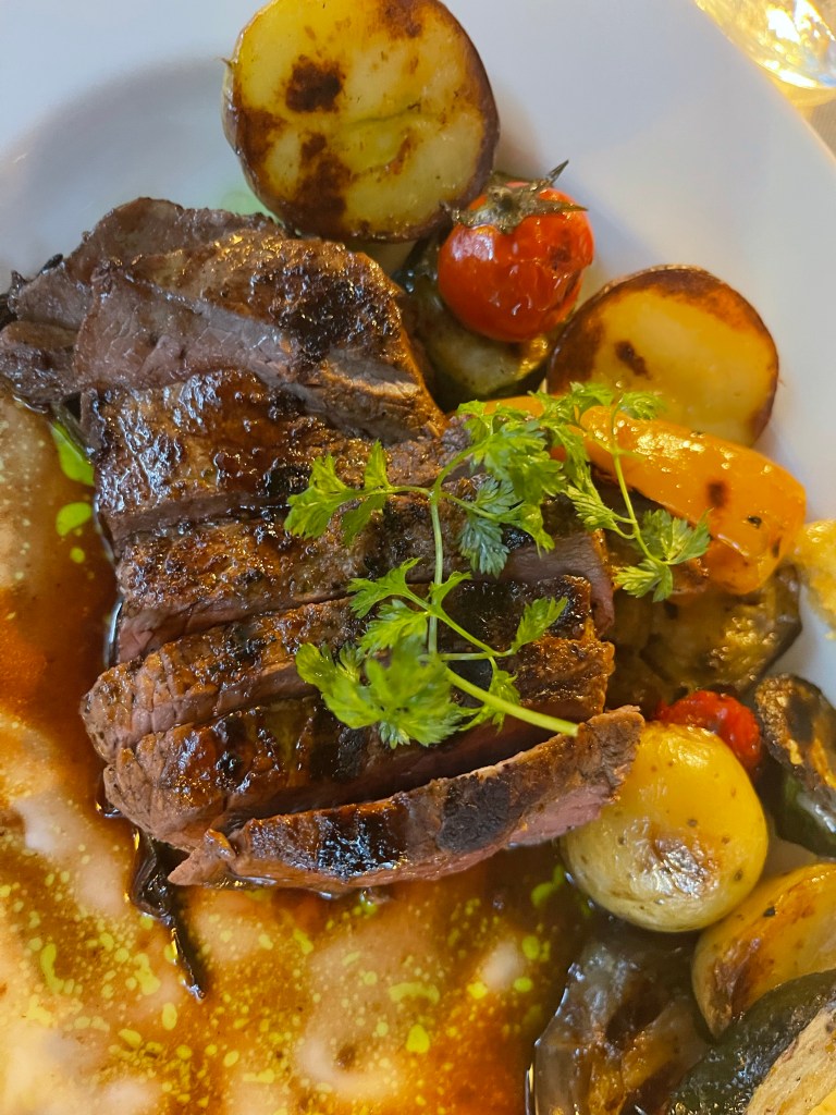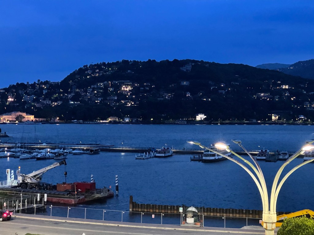 Russell had perch, which is a specialty of Lake ComoI got tagliata and we shared our meals with each otherThe view of Lake Como at night from our balcony