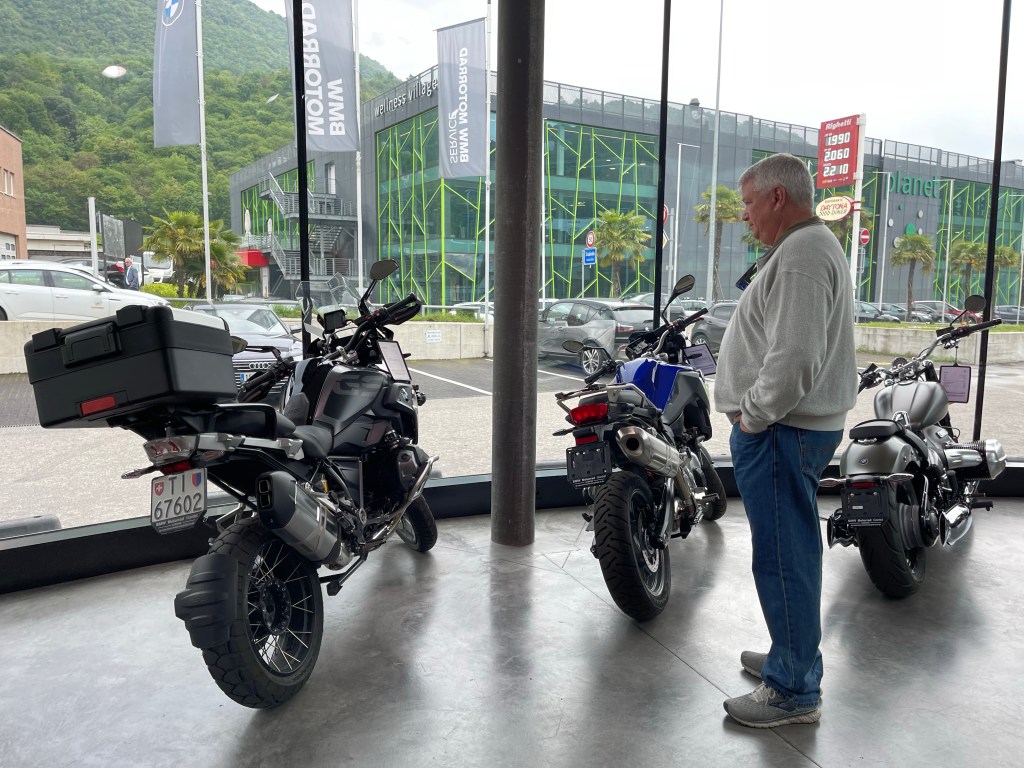 Of course we had to stop at a BMW motorcycle shop in Switzerland! It was a Harley dealer on one side and BMW on the other.