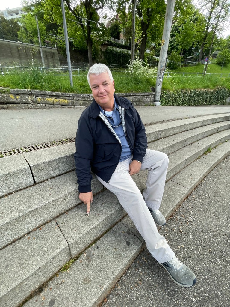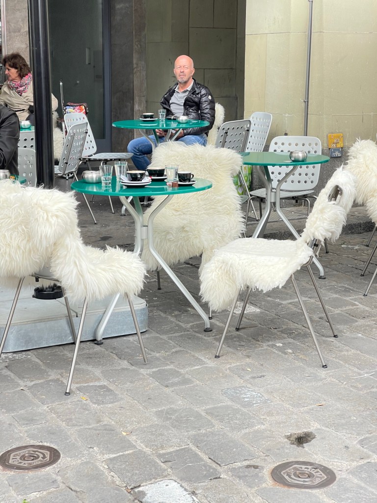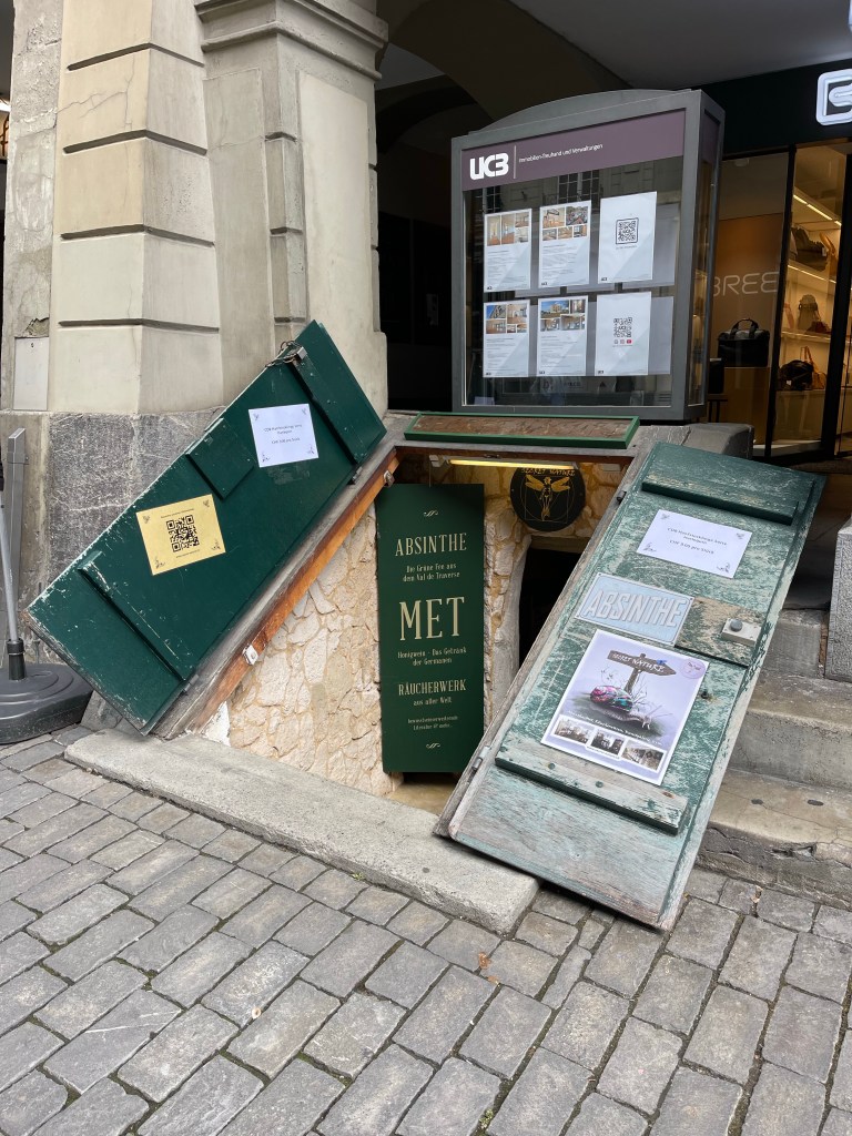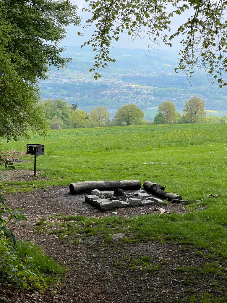 Beautiful buildingsThe outside terrace seating had furs to sit on and keep you warm while eatingAll along the main roads there were cellar doors. They all lead down to more shops and bars below ground. One of the shops down belowThe Swiss love flags and they line the main road leading to the clock tower. The Zytglogge “bell”’is a landmark medieval tower that was built in the early 13th century, it has been a guard tower, prison, clock tower, center of urban life and memorial. Most people in Bern use the electric buses. Here we are trying to master the transit system. We didn’t get lost, so it was a success!Such pretty and unique buildings!We took the funicular (cable car) to the top of Gurten MountainThe view of Bern from aboveAt the top was a a beautiful park area where lots of people were out enjoying the dayThey had frisbee golf, fire pits, grills for cooking, a large play area for kids, and lots of trails for hiking and bikingWe sat here enjoying the view for quite a whileWhat a great day to be outside!Some of the hiking trailsThis was the path we took all around the parkThe restaurant/hotel at the top of GurtenHeading back down the mountainWe went to the rooftop bar of our hotel for the fabulous viewsWe were too full to eat dinner, so we just walked around town and stopped for a pretzel.