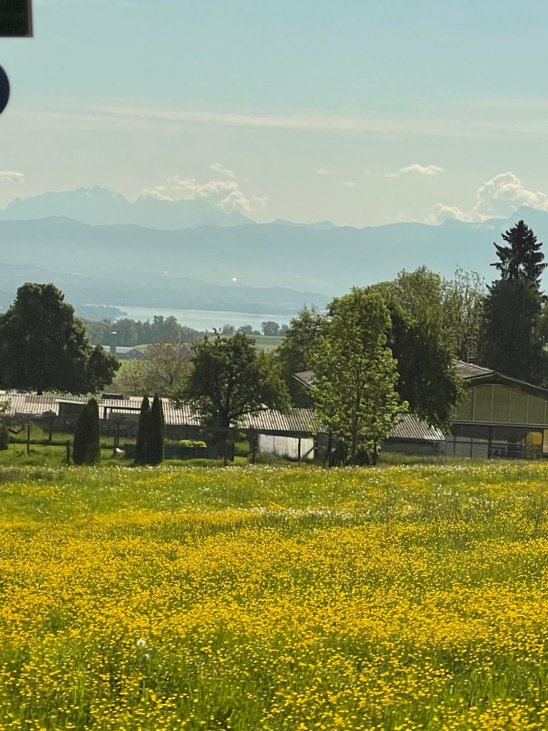 This shows the fields of rapeseed, a beautiful lake created by the glaciers, and the mountain peaks in the distance
