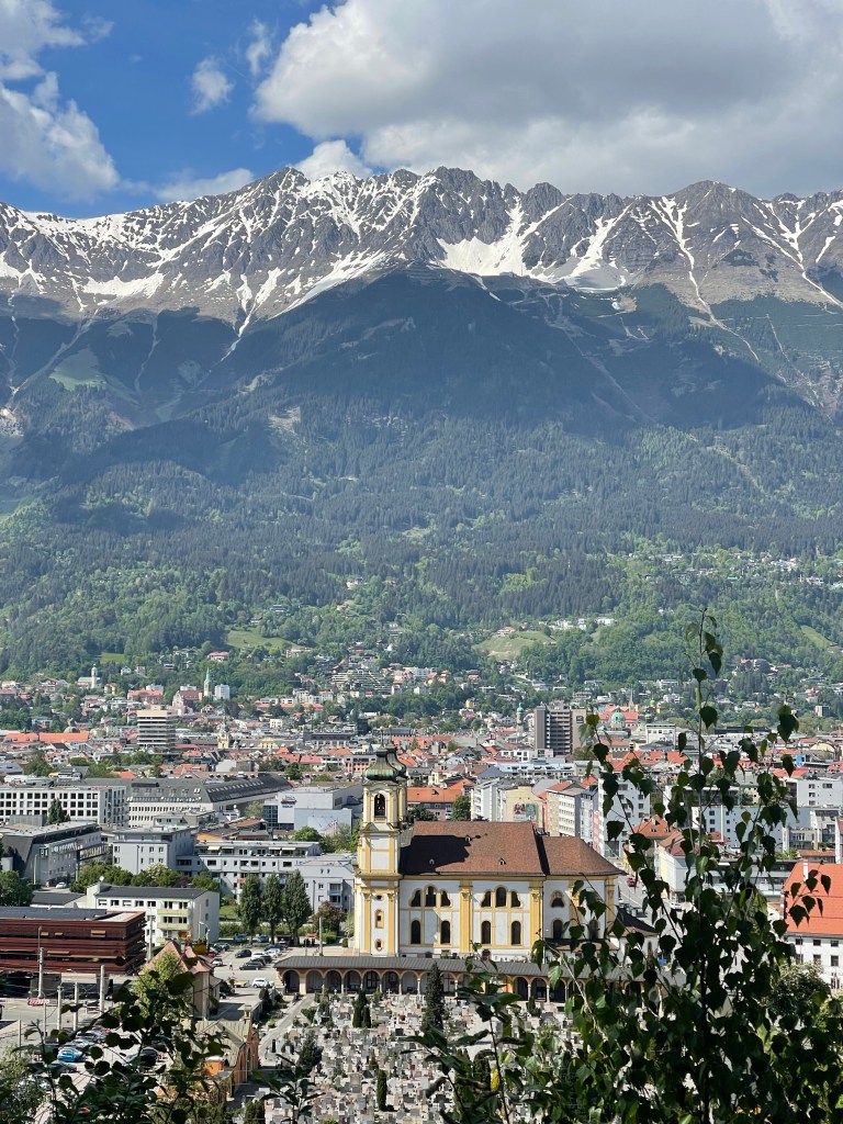 A view of Innsbruck with the mountains in the background